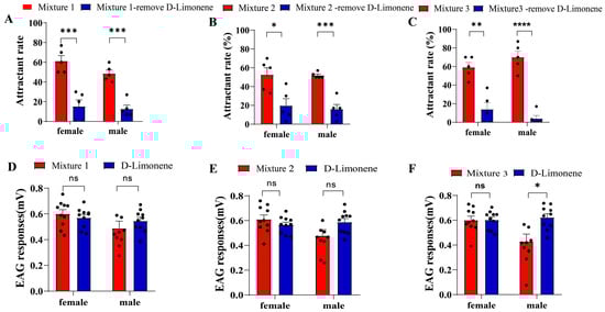 The behavioral and electrophysiological responses produced by the mixtures of chemicals with a high abundance. (A–C) The attractiveness of combinations with or without D-Limonene. (D–F) The electrophysiological response of B. dorsalis to the mixtures and to D-Limonene by itself (N = 5, ns: not significant, * p < 0.05, ** p < 0.01, *** p < 0.001, and **** p < 0.0001).