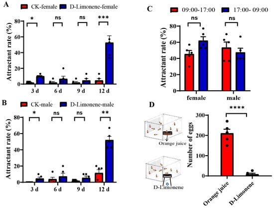 Behavioral responses to D-Limonene. (A,B) Behavioral responses to D-Limonene by males and females at different ages. (C) Behavioral responses of females and males to D-Limonene at different time intervals. (D) Comparison of oviposition behavior in females induced by orange juice and D-Limonene. (N = 5, ns: not significant, * p < 0.05, ** p < 0.01, *** p < 0.001, and **** p < 0.0001).