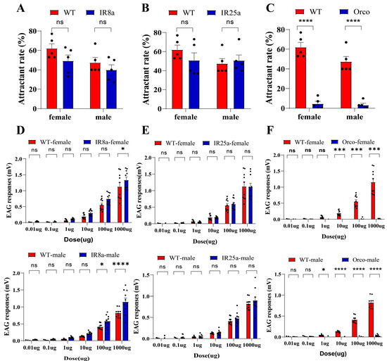 Behavioral and electrophysiological responses of olfactory receptor co-receptor mutants to D-Limonene. (A) Behavioral response of IR8a−/− to D-Limonene. (B) Behavioral response of mutant IR25a−/− to D-Limonene. (C) Behavioral response of Orco−/− to D-Limonene. (D) Electrophysiological response of D-Limonene to IR8a−/−. (E) Electrophysiological response of D-Limonene to IR25a−/−. (F) Electrophysiological response of D-Limonene to Orco−/− (ns: not significant, N = 5, * p < 0.05, *** p < 0.001, and **** p < 0.0001).