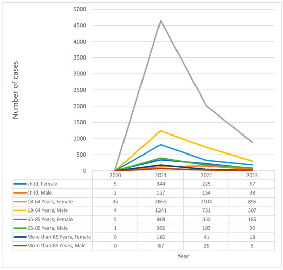 The dataset included 113 types of allergic reactions (n = 13,669). Adverse reactions to the Comirnaty (n = 8734), Spikevax (n = 2857), Vaxzervria (n = 1717), Janssen (n = 340), Novavax (n = 18), VidPrevtyn Beta (n = 1), and Valneva (n = 2) vaccine products were analyzed. When divided by the total number of doses administered in the EEA region for each vaccine, the frequencies of allergic reactions per 100,000 doses to the analyzed vaccines were 1.53 for Comirnaty, 2.16 for Spikevax, 3.1 for Vaxzevria, 2.16 for Janssen, 7.99 for Novavax, 88.6 for Valneva, and 13.3 for VidPrevtyn Beta. It must be noted that Novavax, VidPrevtyn Beta, and Valneva had far fewer administrations (below 1,000,000); thus, the incidence calculations might be uncertain. The results in subgroups according to sex and age are presented in Table 2. In these subgroups, the most reactions occurred in women aged 18–64. In Figure 1, the cases are divided according to the year of report, which shows that despite the greatest number of cases being reported in 2021 during the massive, whole-population vaccination, significant numbers were still reported in 2023, probably mostly in people receiving booster doses. In statistical analysis using chi-square contingency tables, all comparisons in vaccine, sex, and age groups were statistically significant (p < 0.001) due to large sample sizes.