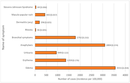 To calculate the frequency of each allergic reaction for the given vaccine, the reported number of cases for every allergic reaction was divided by the total number of doses administered in EU/EEA countries. Moreover, selected reactions that had a similar description of the represented symptom/pathology were grouped into main categories. A detailed table showing the grouping of reactions into main categories is available in the Supplementary Materials.