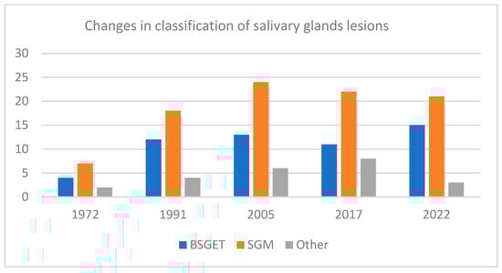 Salivary gland entities reported in WHO from 1972 to 2022 [19]. BSGE = salivary gland benign epithelial tumors; SGM = salivary gland malignancies; Other = non-epithelial, soft tissue, lymphoid, secondary or unclassified salivary gland entities.