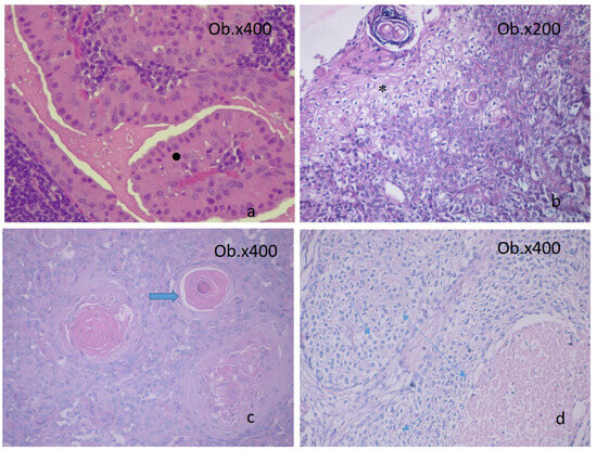 Examples of cells in salivary gland tumors: (a) Warthin tumor with ococytes ●; (b) PA with sebaceus-looking cells *; (c) PA with squamous cells (big arrow); (d) SCD with clear cells (arrows); Ob = objective (images obtained using Leica DM750 microscope with digital camera, 200× and 400× magnification).