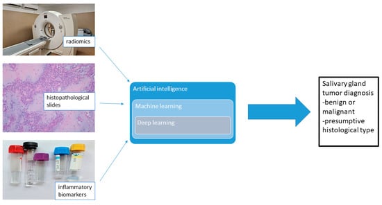 AI-assisted salivary biomarker models for oral cancer diagnosis are now being studied [68]. However, the research field of AI-driven salivary gland tumor analysis is still in development mostly due to the limited number of cases in the same center of diagnosis [69]. A reduced number of parotid gland tumors (ranging from 25 to 293) analyzed with AI algorithms have been reported in the recent literature [57,61,68,69,70,71,72,73,74]. All the data of these studies are examined retrospectively. Deep learning algorithms combined with anomaly detection method were built to differentiate between the magnetic resonance images (MRI) of benign and malignant salivary parotid tumors [70]. Studies have shown that deep learning algorithms outperformed physicians in some cases [71]. Matrix-assisted laser desorption/ionization imaging (MALDI) was used together with artificial neural networks to perform an automated deep learning classification of adenoid cystic carcinoma as a subgroup of salivary gland tumors [72]. Some authors have proposed a two-dimensional convolution neural network U-Net model for identifying Warthin tumors and pleomorphic adenomas of the parotid gland on MRI [73].