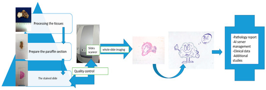 AI algorithms can increase the effectiveness of the pre-surgical diagnosis. However, machine learning diagnostic tools face challenges of algorithm validation, ethics, regulation and difficulty for humans to understand how these artificial neural networks actually make decisions [74,78,90,91,92]. AI analysis algorithms are based on quantitative and qualitative data analysis. For this analysis, numerous data from different diagnosis centers must be included in the study to avoid overfitting. Furthermore, because the data are images, a standardized quality of these images is needed for a higher diagnostic accuracy [71]. In pathology there are some additional steps that are important. For example, the methods of preparing the slide: to have a useful image to analyze the fixation of the tissue, the cutting into sections (e.g., thickness), staining methods and the computer system have to be standardized. The studies that analyze salivary gland tumors usually have a small amount of data to work with because of the rarity of these lesions. Furthermore, the majority of AI-based computed studies are only examining parotid gland tumors; the other major salivary glands and minor salivary glands are not included. If the digital images used to train the computers are manually extracted, then educated pathologists in lesions of head and neck regions have to be involved. Augmentation techniques are used in the AI studies to artificially increase the amount of data by generating new data from the existing data [70]. Because the new data are based on the datasets from the same center, overfitting remains an issue. New datasets are difficult to obtain because of the rarity of the salivary gland tumors. In addition, the need for high-quality images to be analyzed to best characterize the anatomy of the gland or a specific lesion is still there. Histological AI algorithms need to analyze color images, which will generate billions of pixels of data to be processed per patient. For this, specialized AI diagnostic schemes and storage possibilities must be developed [93]. A summary of the steps needed for the application of AI in pathology is shown in Figure 4.