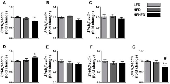 HFHFD differentially altered sirtuins gene expressions in the liver. Fold change of gene expression of (A) Sirt1, (B) Sirt2, (C) Sirt3, (D) Sirt4, (E) Sirt5, (F) Sirt6, and (G) Sirt7 in livers of LFD-, HFD-, and HFHFD-fed mice. Gene expression was normalized to β-actin. n = 7–8, * p < 0.05, ** p < 0.01 compared to LFD group. # p < 0.05 compared to HFD group. $ p < 0.05 with Student’s t-test compared to LFD group.