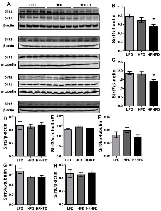 To validate the expression changes detected at the transcriptional level, we further measured the expression of sirtuins at the protein level. Consistent with the gene expression data, protein levels of Sirt1 (p < 0.05, Figure 2A,B) and Sirt7 (p < 0.05, Figure 2A,C) were significantly lower in the HFHFD group compared to the LFD group, but no difference was observed in the HFD group when compared to LFD or HFHFD. The protein expressions of other sirtuins were not observed to be altered in either HFD or HFHFD when compared to the LFD group. Downregulation of Sirt1 and Sirt7 indicates that the HFHFD may disrupt the hepatic metabolism and contribute to liver deregulation progression through epigenetic modification.