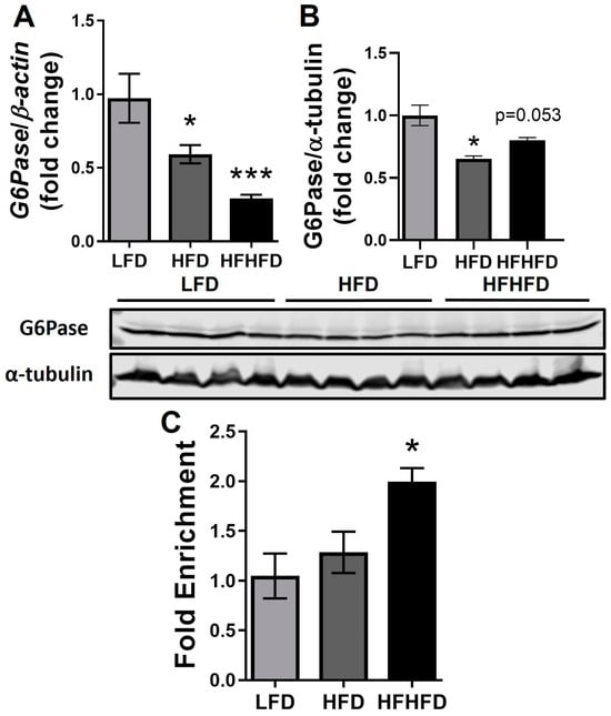 G6Pase is a key regulator of hepatic gluconeogenesis []. Here, we examined the expression of G6Pase to evaluate the effect of HFHFD. Interestingly, HFHFD significantly suppressed the gene expression of G6Pase in the liver compared to LFD (p < 0.001, Figure 3A). The HFD group also exhibited a decrease in G6Pase expression compared to the LFD group (p < 0.05, Figure 3A), but the fold change was less remarkable compared to the trend observed in the HFHFD group. To further validate the result, we measured the protein level of G6Pase. A significantly decreased level of G6Pase was observed in the HFD group compared with the LFD group, and the HFHFD group showed a decreasing trend (p = 0.053) (Figure 3B), suggesting that the downregulation is consistent at gene and protein levels. Sirt7 is an NAD+-dependent deacetylase whose substrates include acH3K18 []. It has been demonstrated that Sirt7 promotes G6Pase expression via H3K18 deacetylation at its promoter region []. To confirm the possible regulation of G6Pase through deacetylation by Sirt7, we probed this interaction using a ChIP assay. We demonstrated that the livers from the HFHFD-fed group exhibited significantly increased acetylation of H3K18 in the G6Pase promoter compared to the LFD (p < 0.05, Figure 3C) group. No changes were found between LFD and HFD. These data indicate that HFHFD inhibits G6Pase through sirtuin-regulated histone modification.