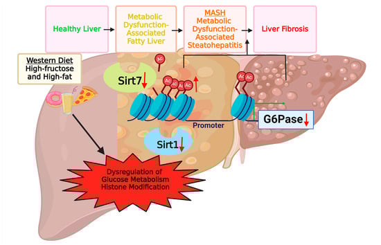 Proposed model of Western diet-induced liver dysfunction via epigenetic regulation. The proposed model posits that a Western diet characterized by high fructose and fat content exerts inhibitory effects on the expression of Sirt1 and Sirt7. This inhibition, in turn, reduces their deacetylation activity during histone modification. This dysregulation has a significant impact on hepatic pathogenetic progression, transitioning from the early stage of metabolic dysfunction-associated fatty liver to the more advanced state of steatohepatitis, culminating in the induction of liver fibrosis. Importantly, this series of events involves dysregulation of histone modification, specifically inhibiting G6Pase expression via promoter hyperacetylation. This inhibition of Sirt1 and Sirt7 has far-reaching implications for glucose metabolism, indicating an intermediate status that lies between steatohepatitis and liver fibrosis. The intricate interplay between dietary components, epigenetic regulation, and the consequential impact on histone modification sheds light on the potential molecular mechanisms driving the progression of liver dysfunction induced by a Western diet. Created with BioRender.com (accessed on 1 June 2024).