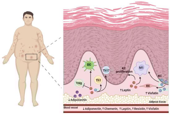 - Chiricozzi, A.; Raimondo, A.; Lembo, S.; Fausti, F.; Dini, V.; Costanzo, A.; Monfrecola, G.; Balato, N.; Ayala, F.; Romanelli, M.; et al. Crosstalk between skin inflammation and adipose tissue-derived products: Pathogenic evidence linking psoriasis to increased adiposity. Expert Rev. Clin. Immunol. 2016, 12, 1299–1308. [Google Scholar] [CrossRef]