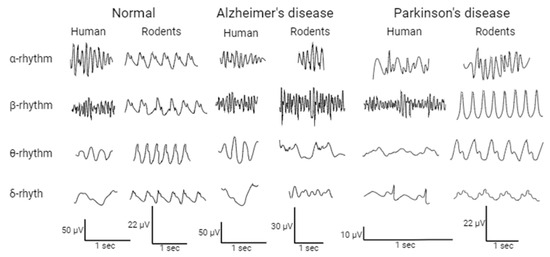 The main EEG changes in human AD are associated with a general slowing down and reduction in α- and β-rhythms, resulting in increased Δ- and θ-activity [142]. In the chemical modeling of AD in rats, a decrease in α- and β-wave frequency was also observed [143]. Additionally, an increase in the cortical slow θ-rhythm and functional slow coupling θ-activity in parieto-occipital regions, along with an increase in Δ-rhythm power, has been found in animals with AD [144]. Moreover, a decrease in α-activity in rats correlates with a decrease in the Δ-range. Additionally characteristic for rodents in AD is a slowing of neocortical EEG, indicating a reduction and desynchronization of EEG patterns [8]. Furthermore, a decrease in higher frequency components of EEG in the occipital and temporal regions of AD patients correlates with cognitive decline and disease severity [16,132,145].