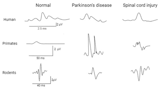 Comparison of somatosensory evoked potentials of EMG between humans and model animals. Spinal cord injury: Human [67], Rodents [68], Primates [69]; Parkinson’s disease: Human [70], Rodents [71], Primates [72]; Normal Human [73], Rodents [68], Primates [74].
