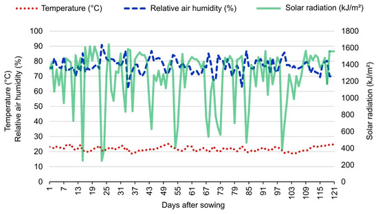 The weather conditions were monitored and quantified using an Automated Weather Station (A607) from the National Meteorological Institute (INMET) (Figure 1). During the experiment (April to August 2020), the average temperature (°C) per day ranged from 18.61 to 25.12, and the humidity from 61.61% to 90.84%. Solar radiation had a maximum of 921.06 and a minimum of 140.38 (µmol/m2s) (Figure 1).