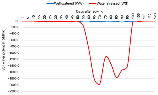 The soil water potential was monitored using five Decagon MPS-6 tensiometers (Decagon, Pullman, WA, USA), which were strategically distributed among the different WCs. The tensiometers were installed in the planting line between 2 plants at a depth of 0.20 m. In WS, where irrigation was suspended 15 days before male anthesis, the permanent wilting point (−1.5 MPa) was reached 63 days after sowing and 3 days after male flowering (CODE 61, state 6, BBCH Scale) (Figure 2).