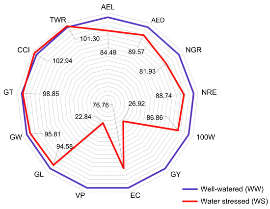The agronomic traits AEL (−15.51%), AED (−10.43%), NGR (18.07%), NRE (11.26%), 100 W (−13.14%), GY (−73.08%), EC (−23.24%) and VP (77.16%) were those most affected by drought, with magnitudes above 10% (Figure 4). The VP, GY, and EC traits were the most affected under water deficit in absolute values. The VP showed an average of 33.58 m3·ha−1 in the WW condition and 7.67 m3·ha−1 in WS, representing a reduction of 77.16%; in turn, the GY expressed an estimate of 1560.43 Kg·ha−1 in WW and 420.03 Kg·ha−1 in WS, with a reduction of 73.08%, while there was a reduction of 23.24% for the EC, with averages of 21.73 mL·g−1 in WW and 16.68 mL·g−1 in WS (Figure 4).