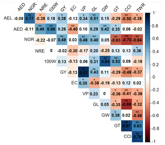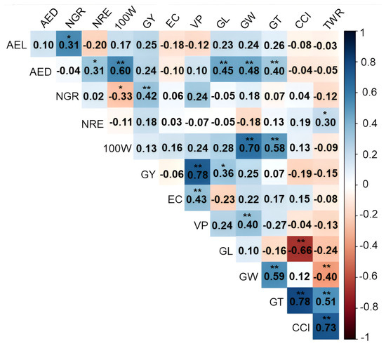 Estimates of the genotypic correlation coefficient (rg) represented by a heatmap between 12 agronomic variables evaluated in 43 popcorn lines under well-watered conditions (WW). * and **, significant at p < 0.05 and significant at p < 0.01, respectively, by the F test. AEL: average ear length; AED: average ear diameter; NGR: number of grains per row; NRE: number of grain rows per ear; 100 W: 100-grain weight; GY: grain yield; EC: expansion capacity; VP: volume of popcorn expanded per hectare; GL: grain length; GW: grain width; GT: grain thickness (mm); CCI: caryopsis circularity index; TWR: thickness/width ratio.