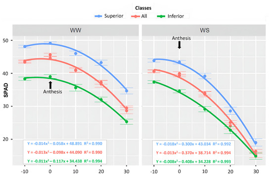 Irrespective of the phenotypic classification (all the lines), the maximum SPAD values were reached later (4 DAAT) in WW when compared to WS (10 DAAT), and these values were also lower in drought. Obtaining the highest possible green index values and delaying senescence contribute to higher agricultural productivity since photosynthetic assimilation of carbon and the mobilization of nutrients from senescing leaves to reproductive organs are important for growth and development [53]. Regardless of the WC, the superior genotypes in terms of productivity remained their stay green for longer duration and expressed peak values later. On the other hand, the inferior genotypes reached the maximum SPAD values earlier. This is an important finding and shows an association between higher SPAD values and higher GY values since leaves with late senescence increase the period of transfer of photoassimilates to fill the grains [53].