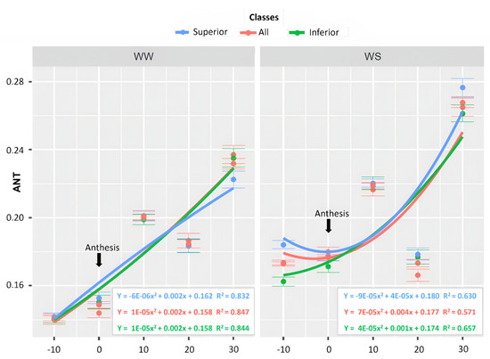 Concerning the ANT values, the superior lines had an estimated β0 of 0.153 in WW and 0.179 in WS. The maximum value was reached at 30 DAA (days after anthesis) for both WCs, with a magnitude of 0.230 in WW and 0.262 in WS (Figure 8). The inferior lines had an estimated β0 of 0.151 in WW and 0.169 in WS (Figure 8). The maximum value was reached at 30 DAA in both WCs. The lines showed a β0 of 0.147 in WW and 0.178 in WS. The highest magnitudes were expressed at 30 DAA in both WCs, with values of 0.233 and 0.267 in WW and WS, respectively (Figure 8).