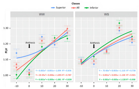 Concerning the FLV values, the superior lines had an estimated β0 of 1.04 in WW and 1.06 in WS. The maximum value was reached at 30 DAA for both WCs, with 1.24 in WW and 1.22 in WS (Figure 9). The inferior lines had β0 estimates of 1.00 in WW and 1.12 in WS (Figure 9). The maximum value was reached at 30 DAA in both WCs. All the lines together showed a β0 of 1.02 in WW and 1.09 in WS. The highest magnitudes were expressed at 30 DAA in both WCs, with values of 1.28 and 1.33 in WW and WS, respectively (Figure 9).