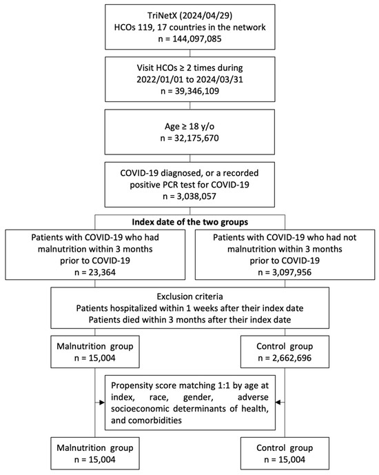 Patients aged >18 years who had more than two visits to HCOs from 1 January 2022 to 31 March 2024 and were diagnosed with COVID-19 (confirmed by a positive polymerase chain reaction test [laboratory test code with TNX: LAB:9088] or an International Classification of Diseases, Tenth Revision, Clinical Modification (ICD-10-CM) code U07.1) [25,26,27] were included in the study. To ensure consistency in terms of disease severity, patients who died within 90 days or were hospitalized within 7 days after contracting COVID-19 were excluded. Patients were further divided into the malnutrition and control groups based on whether they exhibited signs of malnutrition (ICD-10 cm codes: E40–E46) within 90 days before the index date. Our initial cohort from 1 January 2022 to 31 March 2024, consisted of 3,038,057 patients with COVID-19, including 23,364 with malnutrition and 3,014,693 without malnutrition (Figure 1).