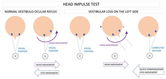 The bedside VOR evaluation is performed by applying the head thrust test (head impulse test—HIT) (Figure 1). During the examination, the patient sits in front of a doctor and is instructed to focus on the examiner’s nose. The physician performs vigorous movements of the patient’s head, made in a horizontal plane, with an appropriate speed, as the reflex has a latency of 7 to 10 ms. Thus, if the head movements are too slow or prolonged, saccades and smooth pursuit, which are movements of a central origin, will also contribute to maintaining focus on the target. Secondly, the movement direction should be random to avoid anticipatory eye movements in cases of alternating predictable trials toward the right and left side. While turning the head to the left, a normal angular horizontal VOR results in the movement of the eyes to the right (Figure 1). The speed of the eyes’ movement is close to the speed of head movement, although the direction is opposite to allow the image to be projected onto the central fovea of the retina and to maintain dynamic visual acuity. In patients with vestibular loss, after moving the head towards the affected side, the patient’s eyes will unconsciously follow the head because the proper vestibulo-ocular reflex cannot be activated. Then, a quick corrective saccade of central origin will enable the patient’s gaze to refocus on the given target.