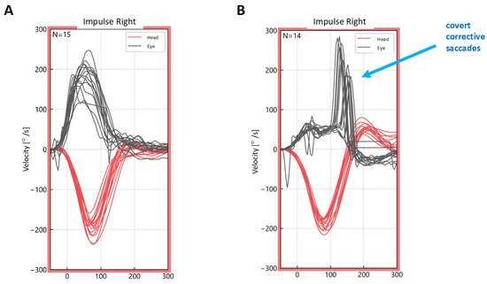 Video head impulse test (vHIT) results—lateral plane, impulse right. (A) Normal vHIT result with the eye movement curves corresponding to head movement curves but directed in the opposite direction. (B) Abnormal vHIT result in a patient with acute vestibular loss on the right side, showing reduced gain (flattened eye movement curve) and corrective saccades.
