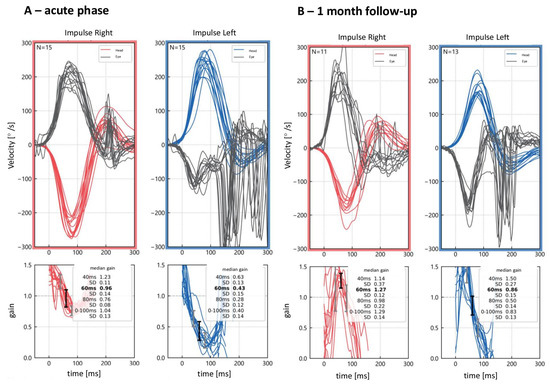 Depending on the stage of VN, different patterns of VOR can be distinguished in the examination (Figure 4). In a retrospective study by Manzari et al. [55], patients were divided into two subpopulations according to the time since the acute vertigo occurred. Significant differences were reported between patients in the acute (within the first 72 h) and subacute (4 days to 6 weeks after the symptoms onset) stages, with the horizontal VOR gain being analyzed. Clinically, the two groups differed in their severity of symptoms assessed in the DHI. Moreover, a significant correlation between the VOR gain and subjective functional level was found after the acute phase of VN.