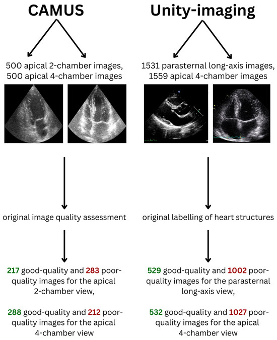 Five hundred apical 4-chamber and 500 apical 2-chamber end-diastolic images from 500 patients were extracted from the CAMUS dataset (Figure 1, Table 1). This dataset was originally provided to resolve the problem of echocardiographic image segmentation and volume estimation [26]. For every image in this dataset, its quality was assessed by an experienced cardiologist and was labelled as “good”, “medium” or “poor”.