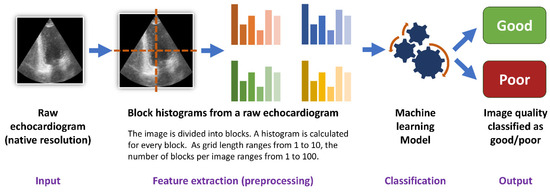 In comparison to many studies that aim to highlight the potential benefits of the use of AI and the development of AI models [5,11,12,13,14,15,16], only Sengupta et al., Huang et al., Nagata et al., and Saikhan et al. analyzed the impact of image quality on the accuracy of clinically relevant echocardiographic measurements and outcomes regarding diagnosis and prognosis [1,2,3,4]. Moreover, a small number of studies aim to predict image quality from two-dimensional raw, unprocessed echocardiogram images [17,18,19]. All of them use convolutional neural networks [17,18,19].
