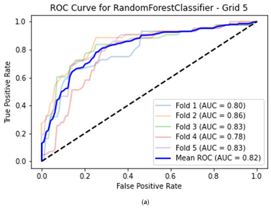 A convolutional neural network based on the corresponding image dataset achieved on average 0.76 (95% CI 0.72–0.79) accuracy, 0.64 (95% CI 0.59–0.68) sensitivity, 0.85 (95% CI 0.82–0.88) specificity and 0.84 (95% CI 0.81–0.87) AUC (Table 3, Figure 5a). There were no statistically significant differences between the deep learning and machine learning models (p > 0.05 for all metrics, Table 4).