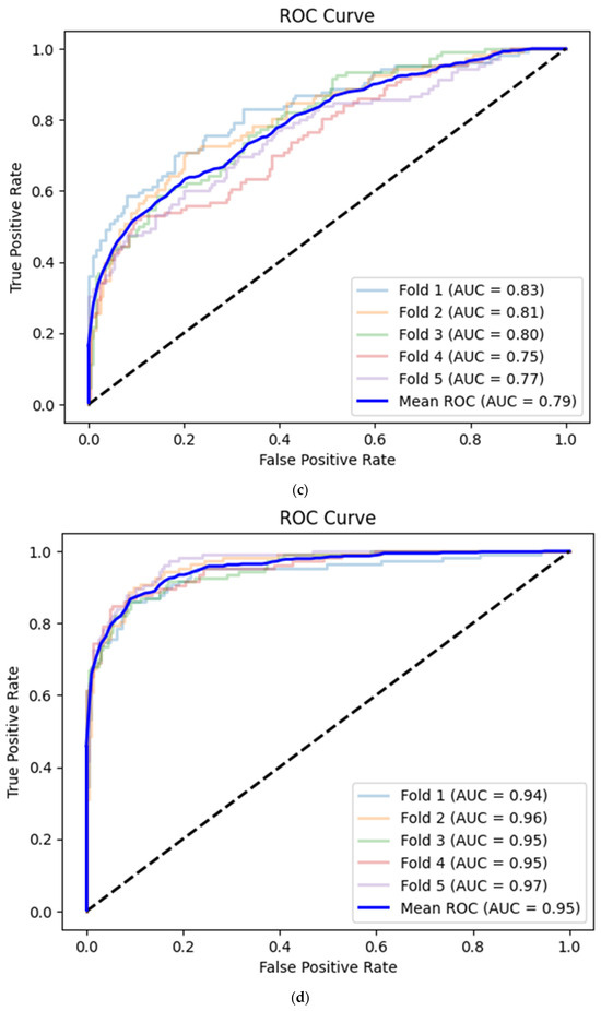 (a) Best model for CAMUS apical 2-chamber view image quality classification—Random Forest classifier (histogram grid length 5) with Receiver Operating Curve. AUC—area under the curve. (b) Best model for CAMUS apical 4-chamber view image quality classification—Random Forest classifier (histogram grid length 10) with Receiver Operating Curve. AUC—area under the curve. (c) Best model for Unity Imaging parasternal long-axis view image quality classification—XGBoost classifier (histogram grid length 10) with Receiver Operating Curve. AUC—area under the curve. (d) Best model for Unity Imaging apical 4-chamber view image quality classification—XGBoost classifier (histogram grid length 8) with Receiver Operating Curve. AUC—area under the curve.