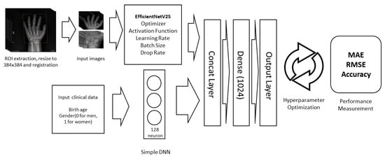 Leveraging a multi-modal approach, we significantly improved the model’s performance by simultaneously processing hand radiographic images through the EfficientNetV2S CNN model and clinical data via a simple DNN model. The model’s strength lies in the strategic integration of outcomes from both sources in the final training stage, harnessing the distinct advantages of image and clinical data. This synergy enhances the model’s robustness, demonstrating the efficacy of multi-modal frameworks in combining diverse data types for better diagnostic precision.