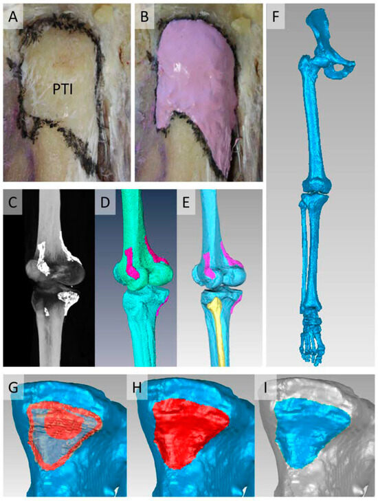 The process of reconstruction of bones and attachment markings is as follows: (A) Contour of the patellar tendon insertion (PTI) footprint at the anterior tibia after dissection by a surgical marker. (B) Painted footprint of the PTI with radiopaque paint. (C) Radiopaque markings of attachments during CT. (D) Rough surfaces after the segmentation process. (E) Smoothed and corrected bone surfaces with unedited paint surfaces. (F) Coherent model with all bones in position after fixation. (G–I) Process of footprint reconstruction. (G) Tracing of contact area through a transparent paint surface on the bone. (H) Fully traced contact area on a bone. (I) Generated footprint surface on the bone.
