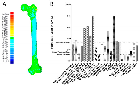 Exemplary deviation analysis of a femur and variation of muscle attachment footprints. (A) Deviation of the segmented surface of CT4 to the reference surface of CT1. Underneath the paint for the vastus intermedius footprint the surfaces deviate strongest because paint and bone surfaces interblend on the CT images. Scale expressed in mm. (B) Coefficient of variation (CV) of each muscle in relation to the mean CV of the bones’ volumes, surface areas and the mean CV of all muscles.