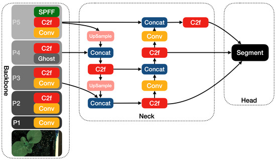 In this work, the YOLOv8 model and two modified versions were used for leaf segmentation. YOLO introduced a new, simplified way to perform simultaneous object detection and classification in images [26,27]. The latest version of YOLO is Yolov8, released in January 2023 by Ultralytics [28], who also created the earlier version YOLOv5 [29]. YOLOv8 uses techniques similar to YOLOACT [30] to provide support for instance segmentation.
