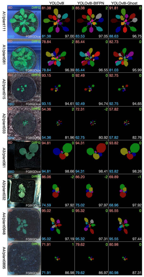 The leaf instance segmentation on the CVPPP LSC dataset was performed by the YOLOv8-seg and the two modified versions, namely the YOLOv8-BiFPN and YOLOv8-Ghost. Taking into comprehensive consideration the data size, the GPU memory size, and the performance, we chose the l-scale in the scale selection of the three models. During the training stage, all of the training sets (A1, A2, A3, A4) were combined together to create a larger dataset; 3/4 was used for training, and 1/4 was used for validation. Since the original size of the dataset is close to 512 × 512, all of the images were resized to 512 × 512. The neural network was trained through 250 epochs with batch size 16. Figure 8 shows selected examples of test images from the four datasets. From each dataset we chose two examples: one to show the effectiveness of the methods and one to show limitations. We have four datasets, so eight pictures were selected and composed into the eight rows in Figure 8. The first column is the test leaf image, the second column is the segmentation result using YOLOv8, the third column is the segmentation result using YOLOv8-BiFPN, and the fourth column is the segmentation result using YOLOv8-Ghost. We show visually the segmentation outcomes for each method together and overlay the numbers of the evaluation measures on the images (Best Dice in the top left corner, Difference in Count in the top right, Symmetric Best Dice in the bottom left, and Foreground–Background Dice in the bottom right).