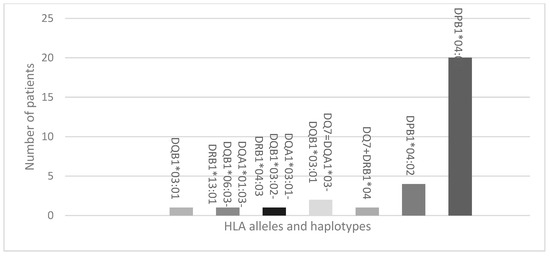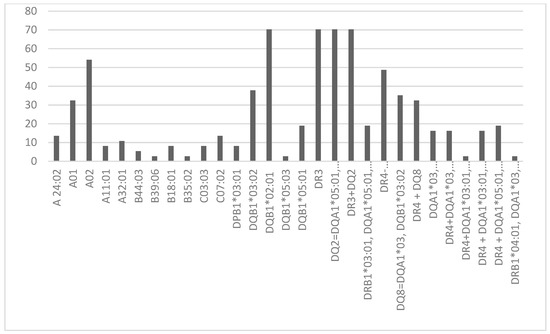 The most frequent predisposing alleles and haplotypes identified were as follows: DR3 (70.27%), DQ2 (70.27%), DR3 + DQ2 (70.27%), DQB1*02:01 (70.27%), A02 (54.05%), DR4 (48.65%), DQB1*03:02 (37.84%), DQ8 (35.14%), A01 (32.43%), DR4 + DQ8 (32.43%). Additionally, the most prevalent protecting allele was DPB1*04:01 (52.63%). These alleles and haplotype frequencies are visualized in Figure 1 and Figure 2.