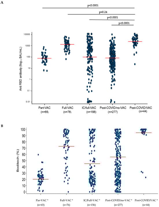 As shown in Figure 1A, the highest anti-RBD antibody levels were observed in samples from the post-COVID/VAC group (2366.0 BAU/mL, 95%CI = 564.6–4167.4) and from the full-VAC (1325.4 BAU/mL, 95%CI = 548.4–2102.5) (difference with post-COVID/VAC group, p = 0.24).