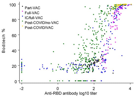 Anti-RBD antibody and seroneutralization in the entire study population. Data represent 618 samples collected from 386 individuals. Levels of anti-RBD antibody (log10-transformed) are plotted against seroneutralization levels (Boditech %) for each individual. Colors highlight groups of immunocompetent individuals who received partial vaccination (part-VAC), full vaccination (full-VAC), immunocompromised individuals with full vaccination (IC/full-VAC), individuals with coronavirus disease 2019 who did not receive vaccination (post-COVID/no-VAC) or received at least one vaccine (post-COVID/VAC).