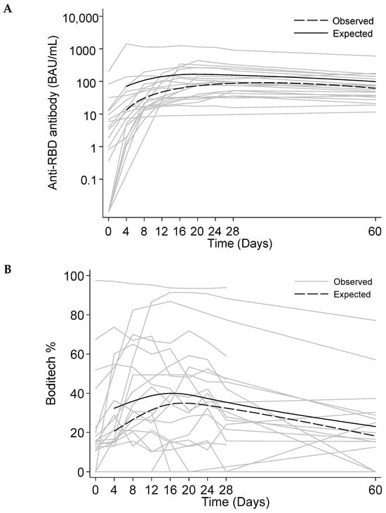 Kinetics of anti-RBD antibody and seroneutralization levels after natural infection. This dataset comprises 168 samples collected longitudinally from 20 individuals post-infection. Individual trajectories for anti-receptor-binding domain (RBD) antibody and seroneutralization (Boditech) levels are given in (A,B), respectively. Day 0 is defined as the first day of COVID symptoms, reported by the patients. For both graphs, the median spline of observed and predicted levels over time are provided as “observed” and “expected” curves. Predicted values were obtained from a non-linear, bi-phasic, growth–decay model described in the statistical analysis.