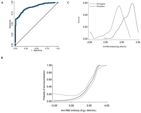 Correlation between anti-RBD antibody and seroneutralization. Data represent 618 samples collected from 386 individuals. The receiving characteristic curve of anti-receptor-binding domain (RBD) antibody levels to predict seroneutralization is given in (A). The probability of seroneutralization is modeled across levels of anti-RBD antibodies in (B), while gray bands around the black line represent the 95% confidence interval. The density histograms of anti-RBD antibody levels are provided for individuals with or without seroneutralization (NT) in (C). For these analyses, all anti-RBD antibody levels were log10-transformed.