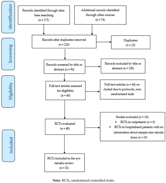 A total of 247 studies were initially identified after querying electronic databases and manual searching. After the removal of 23 duplicates, we screened the titles and abstracts of 224 studies. After the exclusion of 130 records, 94 full-text articles were identified and assessed for eligibility, resulting in the selection of 48 RCTs. Finally, after the exclusion of 16 RCTs (see Supplementary Table S1 for the reasons for their exclusion), 32 RCTs [7,8,10,12,13,14,15,16,17,18,20,21,22,25,26,28,30,31,32,34,35,37,38,39,41,43,45,46,47,48,49,51] were included in the systematic review. The study selection process is summarized in the PRISMA flow diagram in Figure 1. The main characteristics of the studies included in the systematic review are summarized in Table 1. All studies included in this analysis involved patients hospitalized for COVID-19 of various degrees of severity, with the exception of two RCTs [16,47] which recruited critically ill patients admitted to an intensive care unit (ICU). All but two RCTs [31,49] began recruitment in 2020, during the first or second pandemic wave. In 10 of the 32 RCTs (31.2%), the number of cases/controls enrolled was lower than that planned by the study design. The reasons reported by the authors for early study termination were futility at interim analysis (three RCTs) [13,14,43], the EUA from FDA (one RCT) [10], the presence of high-titer nAbs in recipients at admission before CCP transfusion (one RCT) [15], vaccination coverage and the availability of anti-SARS-CoV-2 monoclonal antibodies (mAbs) (one RCT) [49], and slow recruitment due to the trial taking place during the interpandemic period (four RCTs) [21,26,31,32]. For 19 of the 32 (59.4%) selected RCTs, the primary outcome also included mortality rate, with the primary endpoint being reached in 6 studies (18.8%). The 28-day mortality rates differed widely among the studies, with the highest rate being recorded in the CONFIDENT [16] (35.4% in CCP group and 45.0% in control group) and COPLA-II [20] (53.2% in CCP group and 46.8% in control group) trials and the lowest rate being recorded in the ConPlas [17] (3.9% in CCP group and 8.2% in control group) and TSUNAMI [51] (6.1% in CCP group and 7.9% in control group) studies. Two studies [21,49] did not report deaths in either the treatment or control arm. Among the 28 RCTs reporting deaths as a primary or secondary outcome, two RCTs [16,34] (7.1%) reported a 28-day mortality rate significantly lower in CCP-treated patients than controls. Regarding sample size estimation, the great majority of RCTs were designed with a statistical power of 80% and a 5% level of significance. Wide inter-study variation in the expected relative difference in the primary outcome between the CCP treatment and control groups was observed, ranging from 25% to 50%. This heterogeneity among the RCTs was also evident when the expected absolute improvement in the primary outcome of CCP-treated patients was considered, ranging from 15% to 50%.