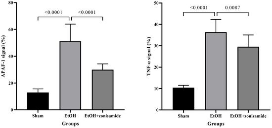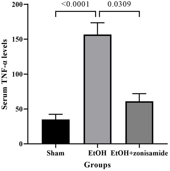 Serum TNF-α levels were significantly increased in the EtOH group compared to the sham group (p < 0.0001). After zonisamide treatment, serum TNF-α levels were significantly decreased in the EtOH + zonisamide group compared to the EtOH group (p = 0.0309), suggesting that zonisamide effectively alleviated ethanol-induced inflammation (Figure 1).