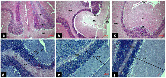 Hematoxylin eosin staining of cerebellar tissues of sham (a), EtOH (b), EtOH + zonisamide (c) group, scale bar: 100 µm, magnification: 10×. Luxol fast blue staining of cerebellar tissues of sham (d), EtOH (e), EtOH + zonisamide (f) group, scale bar: 50 µm, magnification: 20×. GM: gray matter, WM: white matter, ML: molecular layer, GaL: ganglionic layer, GrL: granular layer, Pia: piamater.
