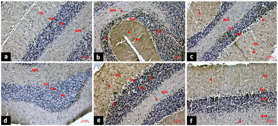 Immunostaining of cerebellar tissue sections is shown in Figure 3. The effects of AA on cell survival were monitored by APAF-1 expression. In the sham group, APAF-1 expression was generally negative in the molecular, ganglionic, and granular layers of the cerebellar cortex and white matter (Figure 3a). Alcohol toxicity induced cell death and increased APAF-1 expression in the EtOH group. The APAF-1 expression was intense in the basket and star cells of the molecular layer, Purkinje cells, and granular cells. The APAF-1 expression was also increased in neuroglia cells in the white matter (Figure 3b). In the EtOH + zonisamide group, APAF-1 expression was decreased in the cerebellar cortex and white matter, suggesting that zonisamide treatment promoted cell survival in the cortical layers (Figure 3c). The neuroinflammatory effect of AA was analyzed by TNF-α expression. In the sham group, TNF-α expression was negative (Figure 3d). In the EtOH group, TNF-α expression increased due to inflammation, especially in neurons in the molecular layer and Purkinje cells (Figure 3e). After zonisamide treatment, TNF-α expression in the EtOH + zonisamide group became mostly negative in ganglionic and granular layers and neuroglia in the white matter (Figure 3f).