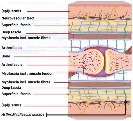 Since the muscle–bone concept is integrated in physiotherapy education courses, clinicians consequently continue to face challenges in defining fascia as an anatomical structure, essential for clinical applications and peer communication. Therefore, this narrative review aims to comprehensively describe the linkages from the skin to bone at the level of a joint, including anatomical structures such as skeletal muscles, fascial tissues, and neurovascular tracts. By defining the anatomical structures from superficial to deeper layers which frame the ArthroMyoFascial complex, our aim is to offer clinicians a comprehensive classification of fascial tissues within the muscle–bone concept. The significance of this work lies in enhancing the clinical concept of fascial tissues, which is crucial for therapeutic testing, treatment, reporting, and multidisciplinary communication, important for comprehending musculoskeletal and orthopedic rehabilitation.