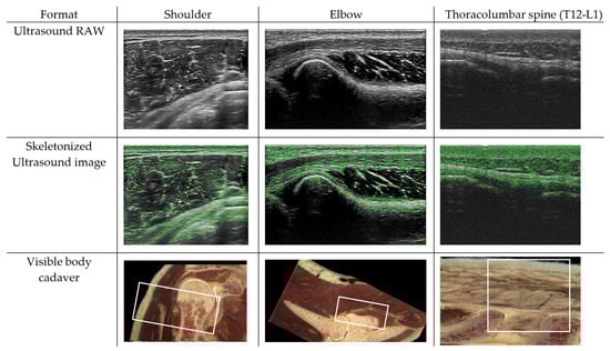 Skeletonized ultrasound images: proof of concept of ArthroMyoFascial linkages. Figure 2 represents images from the right shoulder and elbow as well as the spine. The first row depicts the raw images, which are non-processed images. The second row shows the skeletonized ultrasound images, revealing the connective tissue linkages from skin to bone. The last row represents approximately the same location as in a male human cadaver [].
