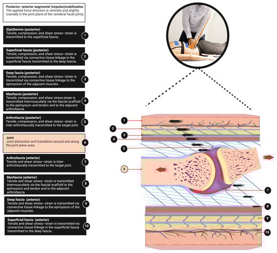 The skin as a force transmission pathway: This model represents how forces from the skin to the joint are transmitted during manual therapy. This applies to manual therapeutic interventions involving the skin, such as myofascial and joint mobilization techniques. Please note that the image does not depict anatomical accuracy for the lumbar spine, but rather a simplified representation to aid in understanding the concept. In this image, a posterior–anterior joint (impulse) mobilization with a cranial component is represented. This refers to a manual therapy approach used by healthcare practitioners, such as physiotherapists, osteopaths, and chiropractors, to address joint dysfunction or stiffness. The technique involves applying controlled pressure or an ‘impulse’ to the joint through the skin and underlying anatomical structures, moving from a posterior (back) to anterior (front) direction, and includes a cranial (head) component. It is important to note that for fascia tissue manipulations in general, the stress experienced and the displacement/strain is greater superior which reduces in depth (bullets 1:10). The main point we are addressing is that during joint mobilizations, the manipulative or mobilizing effects not only affect the arthrofascia but also influence the more superficial anatomical structures. This principle similarly applies to myofascial manipulations. In this figure, we visualize a cranial traction gapping component. While there are multiple components involved (traction, translation, rotation), for didactic purposes, we describe only the traction component. This method aims to apply a controlled pulling force that separates adjacent bones (traction), thereby increasing the joint space (creating a gapping effect) to stretch and soften the arthrofascia. Black vectors indicate the shear direction. Red vectors indicate the joint traction direction, also known as gapping manipulation/mobilization. Orange vector indicates the initial (impulse) mobilization direction applied by the manual therapist. Created with BioRender.com.