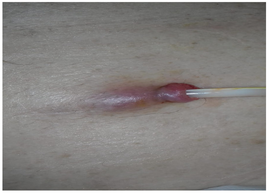 At the beginning of March 2020, the patient presented with erythema, purulent secretion, and pain at the catheter exit site.