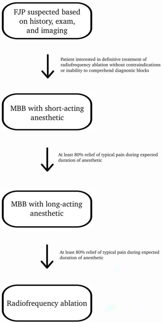 The most appropriate approach and interpretation of medial branch blocks for diagnosis and guiding treatment has been a topic of debate, and many issues are worth noting. Single diagnostic anesthetic blocks are not considered valid as they can have a high false-positive rate [158]. Additionally, lumbar medial branch blocks performed without controls have large false-positive rates (25–41%) [159,160]. More stringent diagnostic criteria may result in more false negatives but may improve outcomes for definitive treatment. Comparative anesthetic blocks with either long-acting or short-acting local anesthetic use on two separate occasions assessing pain relief duration corresponding to the anesthetic used have a sensitivity of 100% and a specificity of 65% [132]. The diagnostic confidence of these tests is complex, as sensitivity, specificity, and disease prevalence are all important factors that contribute to the validity of the test. As the disease prevalence increases, the false-positive rate will decrease, and the diagnostic confidence will increase. For instance, with the sensitivity and specificity listed above and a prevalence of 60%, the diagnostic confidence is 81%, and four out of five positive test results will be correct. If the prevalence drops to 15%, only one out of eight positive responses will truly be positive. As such, to avoid false-positive results, placebo-controlled blocks may be the best way to increase diagnostic confidence [161]. Unfortunately, insurers in the United States do not cover placebo-controlled blocks as the definitive procedure does not exceed the cost of blocks by a factor of 1.5, thus making placebo-controlled blocks not cost-effective [162]. As discussed below, radiofrequency ablation of the nerves innervating the facet joints is a common treatment for painful facet joints after diagnostic blocks have been performed. An example of a typical treatment paradigm for radiofrequency ablation can be seen in Figure 2.